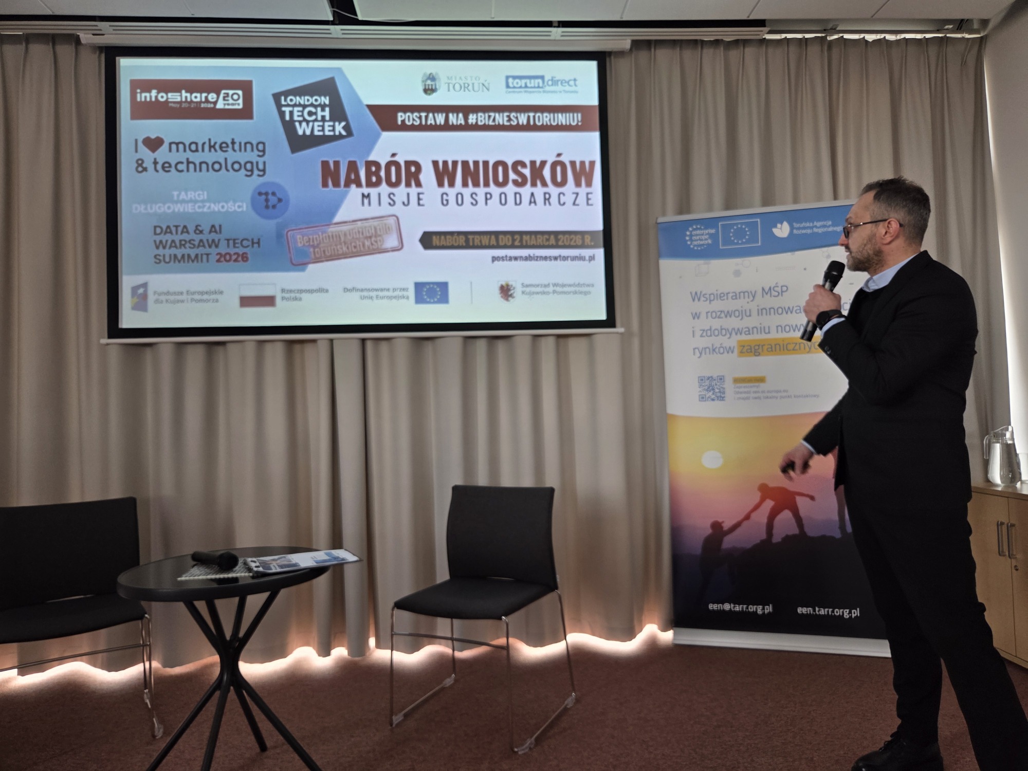 W dniu 19 lutego br. w siedzibie Izby Przemysłowo - Handlowej w Toruniu odbyło się spotkanie informacyjne poświęcone dotacjom oraz programom wsparcia dla przedsiębiorców w 2026 r. Wydarzenie stanowiło element działań informacyjnych skierowanych do lokalnych firm zainteresowanych rozwojem, internacjonalizacją oraz ekspansją na nowe rynki.